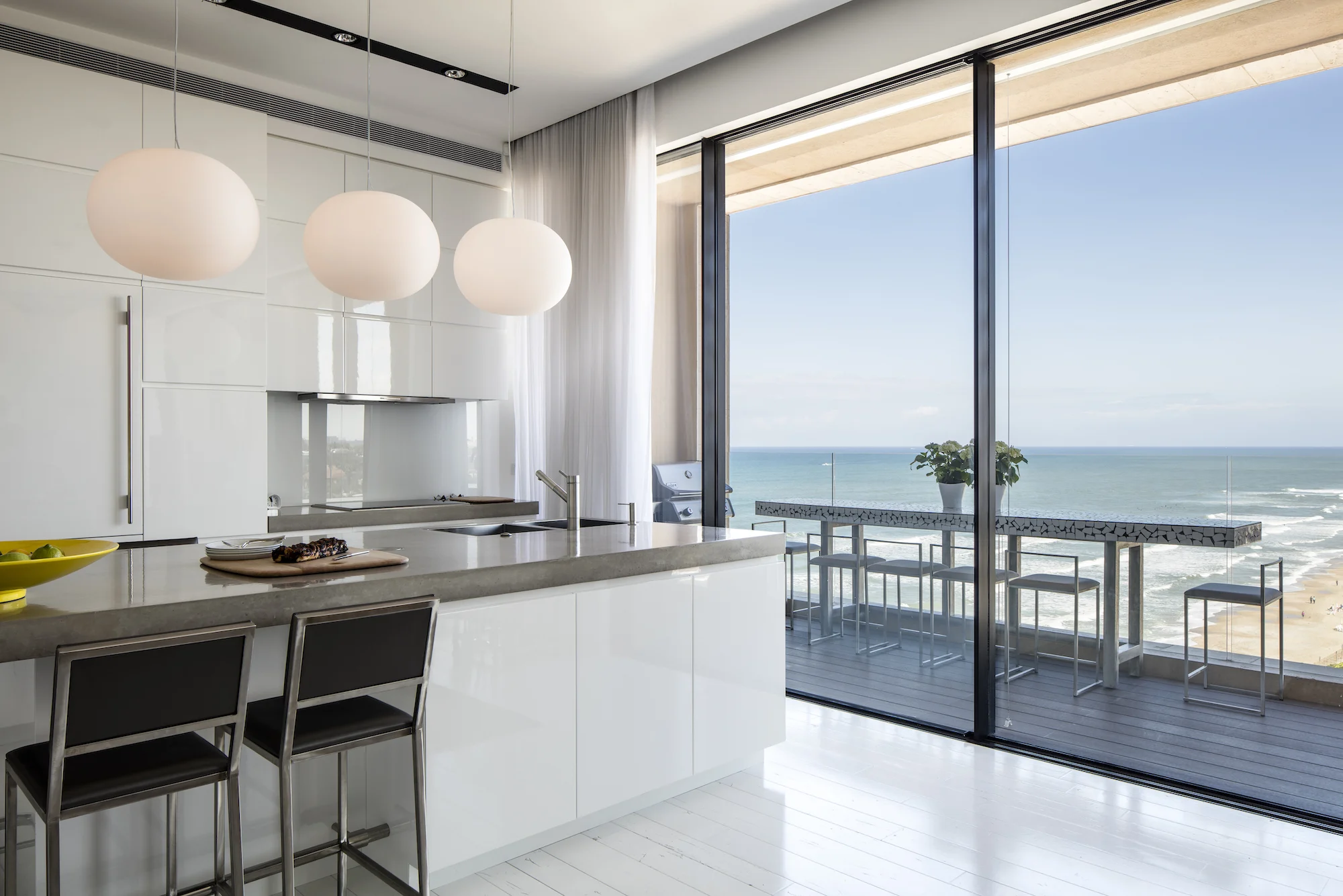 A total renovation of a double height duplex on the beachfront of Herzelia designed as a vacation home for a family that resides overseas. The integration of the inside and outside is emphasized in the constant contiuity of space from function to function and the opening of all spaces to the central double height entertaining area – all facing the seaview. Great attention was made to ensure the flow of materials used throughout the duplex. An exact color palette, textures and materials all creating an intimate vacation-like feel to the place as if "floating on the sea".